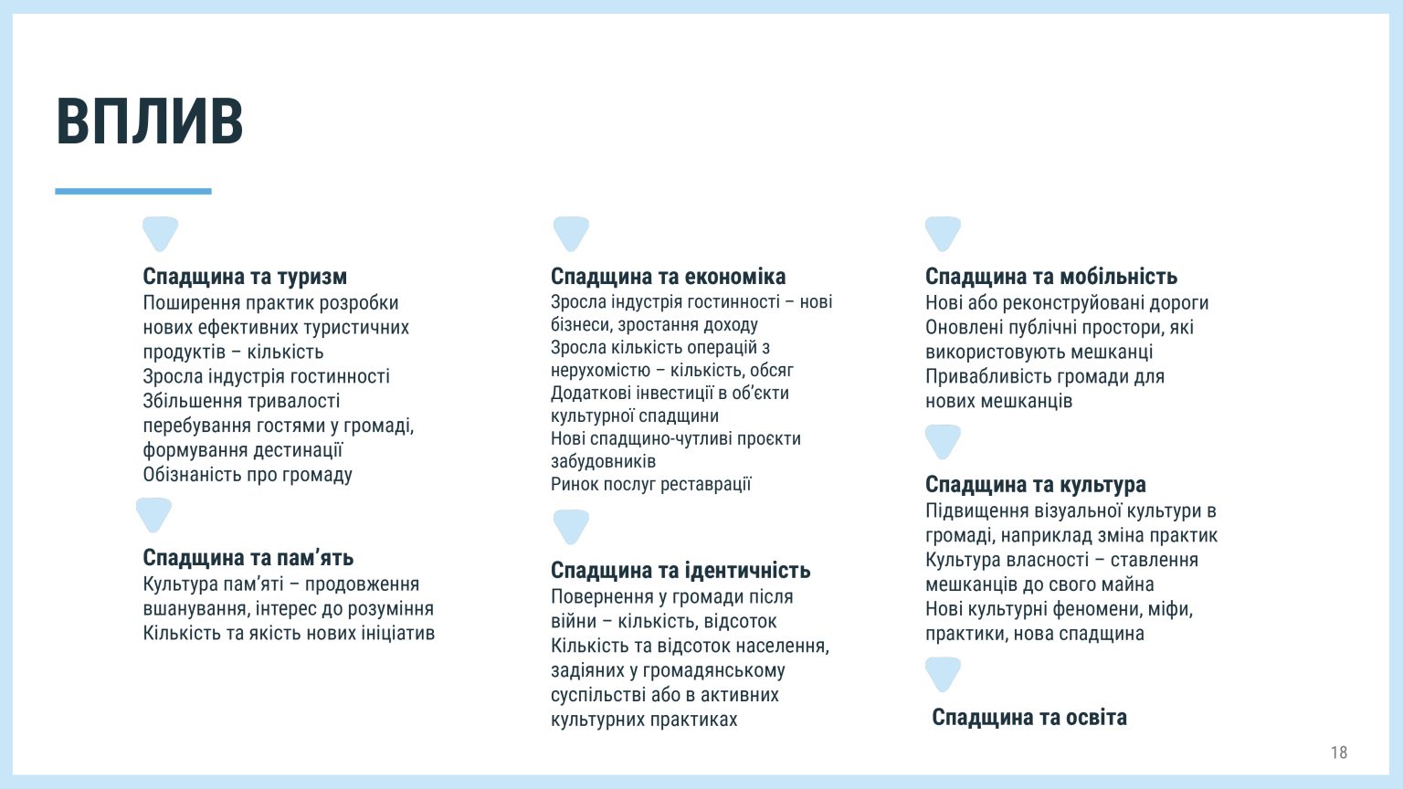 - Міфи і реальність: існує поширене уявлення про спадщину як про маловідоме минуле та історію, й варто про неї розповісти – як це привабить туристів. Проте насправді, культурна спадщина — це актив території та ресурс для її розвитку в майбутньому. Вона потребує ефективного управління, створення умов доступності та якісної комунікації для позитивного впливу на життя громади.