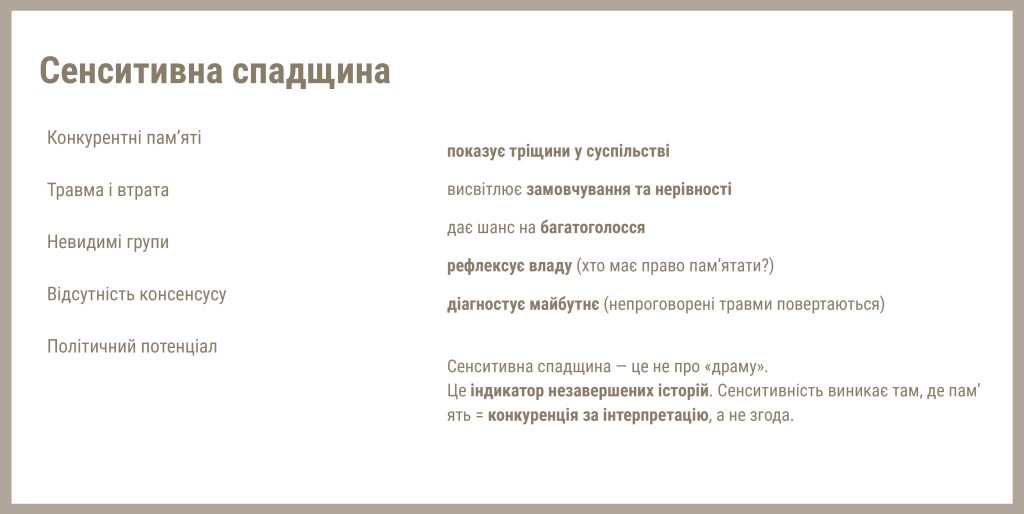 - Як працювати з конфліктною історією? Війни, втрати, репресії, геноцид та інші травматичні події внаслідок яких виникла сенситивна культурна спадщина. Робота з такими об’єктами та історією потребує уваги та чутливі, проговорення травм яке не переходить у ретравматизацію.